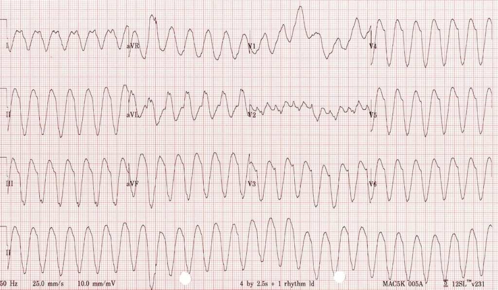 In this scenario, the learner is called to the ward to assess a 65-year old male with new VT. The learner must recognize the rhythm and institute appropriate work-up and management including electrical cardioversion.