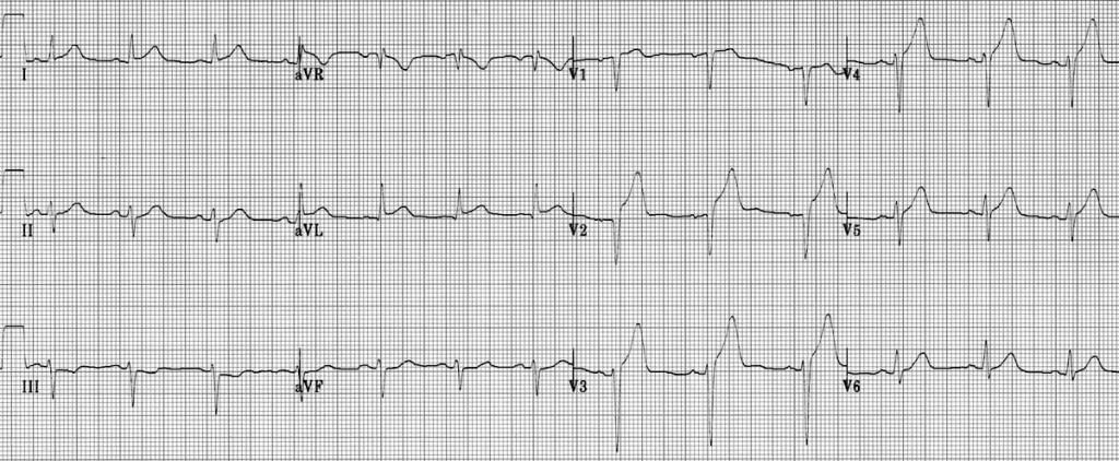 A 50-year old woman presents to the emergency department with 1.5 hours of chest pain and left arm heaviness. She works at a long term care facility where she has been caring for COVID-19 positive patients. She has had two days of mild URTI symptoms. She looks moderately unwell and has been placed in a resuscitation room with droplet/contact precautions.