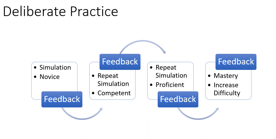 Hunt and colleagues describe RCDP as “rapid cycle between deliberate practice and directed feedback until skill mastery is achieved” after which progression in case difficulty can proceed. This model includes drilling/practicing the “right way” to take advantage of overlearning as described above); relying on expert feedback to show the learner the gold standard rather than having them figure it out; and psychological safety.